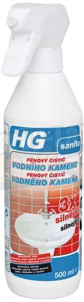 Vysoce účinným odstraňovačem vodního kamene je HG pěnový čistič vodního kamene. Je 3x silnější a tak se díky tomuto přípravku zbavíte i těch nejodolnějších nánosů vodního kamene. Je šetrný ke všem chromovým povrchům, glazurám a spárám.