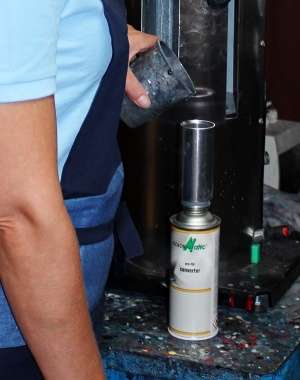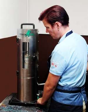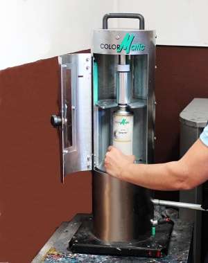 5. Hydraulickou pákou se posune sprej nahoru a teflonový píst vtlačí barvu z nádobky do spreje.