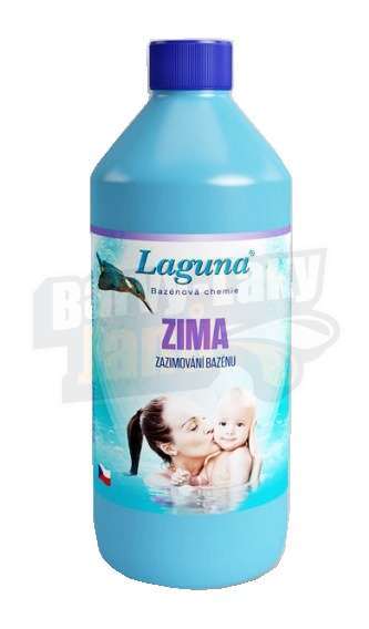 Vypusťte vodu v bazénu pod skimmer a zpětné trysky. Upravte hodnotu pH a chlóru a použijte přípravek Laguna Zima. Potřebné množství nařeďte 1:15 vodou a podél okraje nalijte do bazénu.
